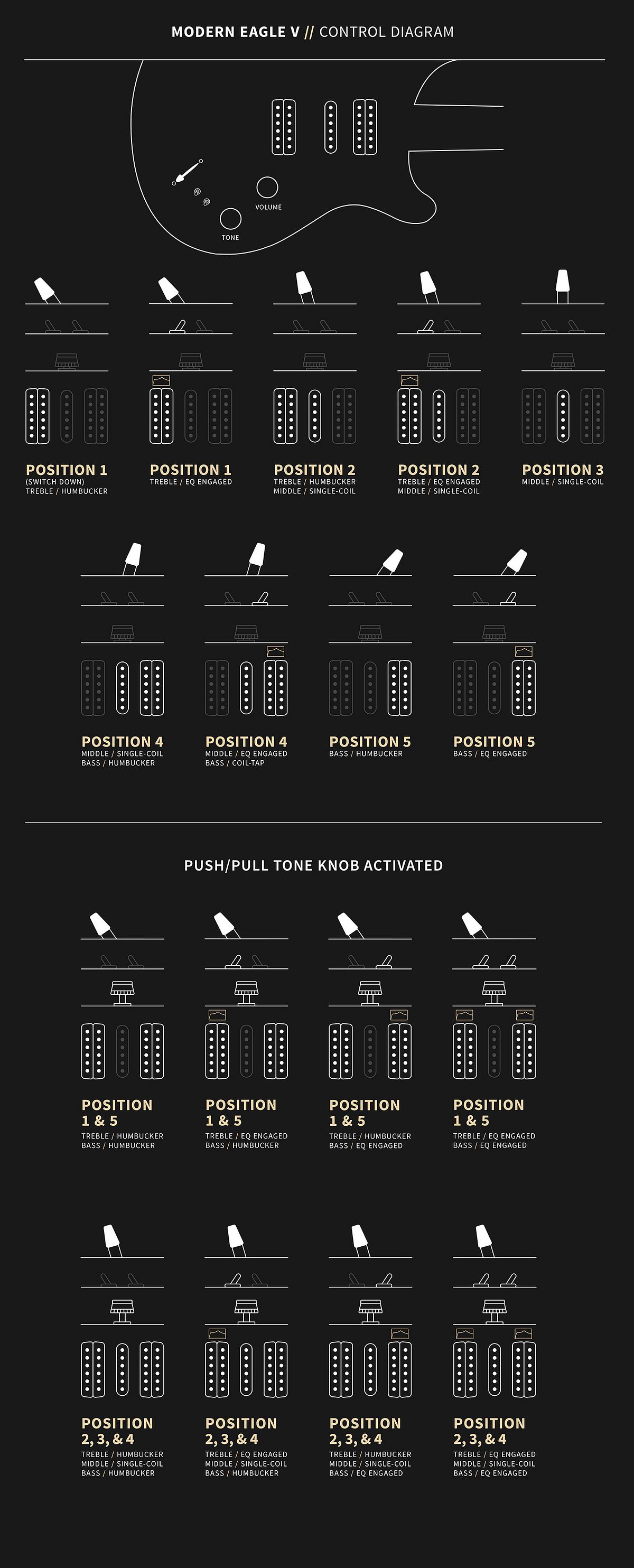 Utilizing a hum/single/hum (five-coil) pickup layout and unique electronics configuration, the Modern Eagle V gives players a vast array of tones in one guitar. The 5-way blade switch selects the pickups in intuitive groupings: treble, treble and middle, middle, middle and bass, and bass. There is a single volume and a push/pull tone control that activates both humbuckers when engaged; this allows players to access all three pickups simultaneously. Finally, the dual EQ mini-toggle switches act as tuned high-pass filters when engaged (in the up position), removing shelved low-end and allowing the high frequencies through for more clarity and musical highs.