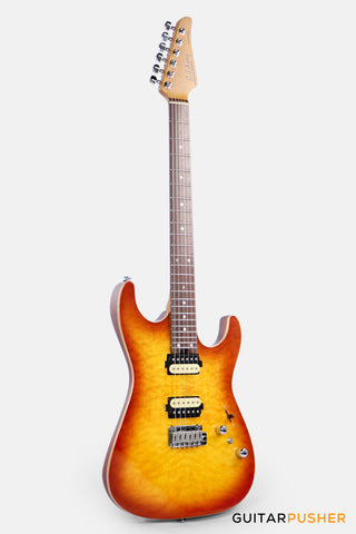The Soloking MS-1 Custom 24 HH Quilt with Rosewood FB in Honeyburst Wakesurf (JESCAR) is a premium, custom-grade instrument designed for players who want striking aesthetics paired with powerful dual-humbucker versatility. With its 6mm 5A Quilt Maple Top, Canadian Quartersawn Roasted maple neck, JESCAR Stainless Steel frets, and Soloking TrueGrit HH Alnico pickups, this model delivers boutique tone, exceptional comfort, and a commanding modern presence. Beautifully crafted and performance-ready, this guitar is built for expressive players who demand the best.